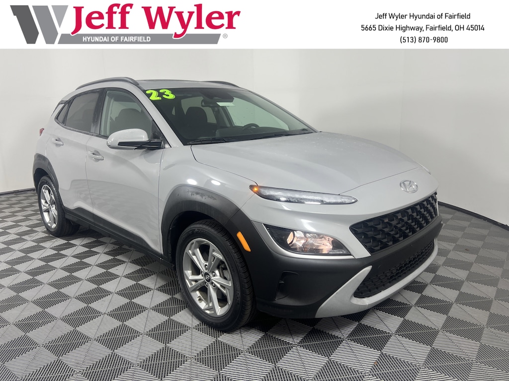 CARFAX One-Owner. Clean CARFAX. Jeff Wyler Hyundai of Fairfield is proud to offer this wonderful-looking 2023 Hyundai Kona SEL in Cyber Silver. Well equipped with: Cargo Package (Cargo Net and Cargo Tray), Convenience Package (Heated Front Seats, Hyundai Digital Key, Leather-Wrapped Shift Knob, Option Group 02, Radio: AM/FM/SiriusXM/HD Audio System, and Wireless Device Charging), Hyundai Certified Used Vehicles Certified, Android Auto, Apple CarPlay, CALL NOW FOR YOUR VIP APPOINTMENT 513-870-9800, FULLY SERVICED w/RECORDS, GUARANTEED FINANCING!! NO MATTER YOUR SITUATION WE CAN GET AN APPROVAL!!, THE #1 Volume dealer in the region! Come see why for yourself Today!!, WE PAY MORE FOR YOUR TRADE!!, 17" x 7.0J Alloy Wheels, 4-Wheel Disc Brakes, 5.715 Axle Ratio, 6 Speakers, ABS brakes, Air Conditioning, Alloy wheels, AM/FM radio: SiriusXM, Apple CarPlay & Android Auto, Brake assist, Bumpers: body-color, Carpeted Floor Mats, Cloth Seat Trim, Delay-off headlights, Driver door bin, Driver vanity mirror, Dual front impact airbags, Dual front side impact airbags, Electronic Stability Control, Emergency communication system: Blue Link Connected Car Service (3-year complimentary subscription), Exterior Parking Camera Rear, First Aid Kit, Four wheel independent suspension, Front anti-roll bar, Front Bucket Seats, Front Center Armrest, Front reading lights, Fully automatic headlights, Heated door mirrors, Illuminated entry, Low tire pressure warning, Occupant sensing airbag, Outside temperature display, Overhead airbag, Overhead console, Panic alarm, Passenger door bin, Passenger vanity mirror, Power door mirrors, Power driver seat, Power steering, Power windows, Radio: AM/FM/HD/SiriusXM Audio System, Rear anti-roll bar, Rear seat center armrest, Rear window defroster, Rear window wiper, Remote keyless entry, Security system, Speed control, Speed-sensing steering, Split folding rear seat, Spoiler, Steering wheel mounted audio controls, Tachometer, Telescoping steering wheel, Tilt steering wheel, Traction control, Trip computer, Turn signal indicator mirrors, and Variably intermittent wipers. Certified. Hyundai Certified Used Vehicles Details: * Limited Warranty: 60 Month/60,000 Mile (whichever comes first) from original in-service date * Warranty Deductible: $50 * Includes 10-year/Unlimited Mileage Roadside Assistance with Rental Car and Trip Interruption Reimbursement; Please See Dealers for Specific Vehicle Eligibility Requirements. 10-Year/100,000 Mile Hybrid/EV Battery Warranty. 3-Months SiriusXM Trial Subscription. Complimentary 1 Year (Connected Care & Remote Pkgs). * Vehicle History * 173+ Point Inspection * Powertrain Limited Warranty: 120 Month/100,000 Mile (whichever comes first) from original in-service date * Roadside AssistanceTO CHECK ON THE AVAILABILITY OF THIS VEHICLE REACH OUT TO ONE OF OUR TEAM MEMBERS!! ALSO SHOP ONLINE AT https://www.jeffwylerhyundaioffairfield.com/ Proudly Serving: Cincinnati, Dayton, Columbus, Louisville, Lexington, Indianapolis, Hamilton, Florence, Alexandria, Beavercreek, Springdale, West Chester, Monroe, Fairfield, Kenwood, Newport and all of greater Cincinnati Ohio, Indiana, and Northern Kentucky.
