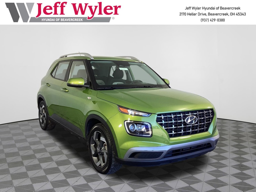 Clean CARFAX. Certified. Hyundai Certified Used Vehicles Details: * Vehicle History * Warranty Deductible: $50 * Limited Warranty: 60 Month/60,000 Mile (whichever comes first) from original in-service date * Includes 10-year/Unlimited Mileage Roadside Assistance with Rental Car and Trip Interruption Reimbursement; Please See Dealers for Specific Vehicle Eligibility Requirements. 10-Year/100,000 Mile Hybrid/EV Battery Warranty. 3-Months SiriusXM Trial Subscription. Complimentary 1 Year (Connected Care & Remote Pkgs). * 173+ Point Inspection * Powertrain Limited Warranty: 120 Month/100,000 Mile (whichever comes first) from original in-service date * Roadside AssistanceJeff Wyler Hyundai of Beavercreek is pleased to offer this beautiful 2023 Hyundai Venue SEL in Green Apple. Well equipped with: Option Group 01, 4-Wheel Disc Brakes, 6 Speakers, 6.052 Axle Ratio, 6.5J x 17" Alloy Wheels, ABS brakes, Air Conditioning, Alloy wheels, AM/FM radio, Apple CarPlay & Android Auto, Auto High-beam Headlights, Automatic temperature control, Brake assist, Bumpers: body-color, Cargo Net, Cargo Tray, Carpeted Floor Mats, Cloth Seat Trim, Delay-off headlights, Driver door bin, Driver vanity mirror, Dual front impact airbags, Dual front side impact airbags, Electronic Stability Control, Front anti-roll bar, Front Bucket Seats, Front Center Armrest, Front reading lights, Front wheel independent suspension, Fully automatic headlights, Illuminated entry, Leather Shift Knob, Leather steering wheel, Low tire pressure warning, Mudguards, Occupant sensing airbag, Outside temperature display, Overhead airbag, Overhead console, Panic alarm, Passenger door bin, Passenger vanity mirror, Power door mirrors, Power moonroof, Power steering, Power windows, Radio: AM/FM/HD Display Audio, Rear Seat Cup Holder, Rear window defroster, Rear window wiper, Remote keyless entry, Roof rack: rails only, Security system, Speed control, Speed-sensing steering, Split folding rear seat, Spoiler, Steering wheel mounted audio controls, Tachometer, Telescoping steering wheel, Tilt steering wheel, Traction control, Trip computer, and Variably intermittent wipers.Come see the excitement at Jeff Wyler Hyundai of Beavercreek! Visit us online at www.jeffwylerhyundaiofbeavercreek.com Proudly Serving: Cincinnati, Dayton, Centeville, Ketttering, Moraine,Beavercreek, Xenia,Oakwood, Trotwood, Vandalia, Kettering, Wright Patterson, Riverside, Engelwood, Miamisburg, Huber Heights, Springboro, Brookville, Fairborn, West Carrollton, Yellow Springs, Bellbrook, Springfield Columbus, Hamilton, West Chester, Monroe, Fairfield. PROUDLY SERVING: CINCINNATI, DAYTON,COLUMBUS, LOUISVILLE, LEXINGTON, INDIANAPOLIS,HAMILTON, FLORENCE, ALEXANDRIA, BEAVERCREEK, SPRINGDALE, WEST CHESTER, MONROE, FAIRFIELD, KENWOOD, NEWPORT AND ALL OF GREATER CINCINNATI OHIO, INDIANA, AND NORTHERN KENTUCKY.