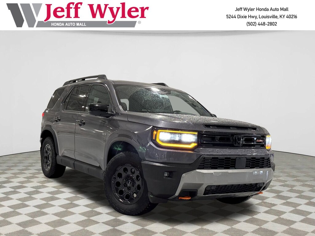 Jeff Wyler Honda Automall is pleased to offer this fantastic 2026 Honda Passport TrailSport Elite Blackout in Modern Steel Metallic. Well equipped with: 12 Speakers, 4-Wheel Disc Brakes, ABS brakes, Adaptive Cruise Control: Adaptive Cruise Control (ACC) with Low-Speed Follow, Air Conditioning, Alloy wheels, Apple CarPlay/Android Auto, Auto High-beam Headlights, Auto-dimming door mirrors, Auto-dimming Rear-View mirror, Automatic temperature control, Blind Spot Information (BSI) System warning, Brake assist, Compass, Delay-off headlights, Driver door bin, Driver vanity mirror, Driver's Seat Mounted Armrest, Dual front impact airbags, Dual front side impact airbags, Electronic Stability Control, Emergency communication system: HondaLink, Exterior Parking Camera Rear, Four wheel independent suspension, Front anti-roll bar, Front Bucket Seats, Front Center Armrest, Front dual zone A/C, Front fog lights, Front reading lights, Fully automatic headlights, Heated & Ventilated Front Bucket Seats, Heated door mirrors, Heated front seats, Heated rear seats, Heated steering wheel, HVAC memory, Illuminated entry, Knee airbag, Lane departure: Lane Keeping Assist System (LKAS) active, Leather steering wheel, Low tire pressure warning, Memory seat, Navigation system: Google Maps, Occupant sensing airbag, Outside temperature display, Overhead airbag, Overhead console, Panic alarm, Passenger door bin, Passenger seat mounted armrest, Passenger vanity mirror, Perforated Leather Seat Trim, Power door mirrors, Power driver seat, Power Liftgate, Power moonroof, Power passenger seat, Power steering, Power windows, Radio data system, Radio: Bose Premium Sound System w/12 Speakers, Rain sensing wipers, Rear air conditioning, Rear anti-roll bar, Rear reading lights, Rear seat center armrest, Rear window defroster, Rear window wiper, Remote keyless entry, Security system, Speed control, Speed-sensing steering, Split folding rear seat, Spoiler, Steering wheel mounted audio controls, Tachometer, Telescoping steering wheel, Tilt steering wheel, Traction control, Trip computer, Turn signal indicator mirrors, Variably intermittent wipers, Ventilated front seats, and Wheels: 18" HPD Black Alloy.Wyler Family First Package Includes: NanoCure Appearance Protection: Exterior & Interior Chemical Sealant Applied to Protect Against Environmental Hazards (7 Year Warranty Coverage). Pulse- Rear end Collision Avoidance System Theft Deterrent Strategy gives you 5 Years of Coverage against vehicle Theft, Offering up to a $5,000 benefit. Price includes: $500 - Honda Graduate Offer. Exp. 03/31/2026 $500 - Honda Military Appreciation Offer. Exp. 03/31/2026