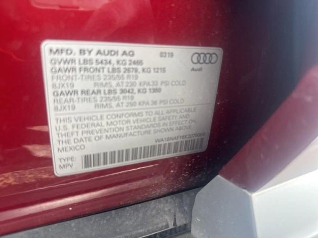 Recent Arrival! Leather. 22/27 City/Highway MPG Clean CARFAX.Awards: * 2019 KBB.com 10 Best Luxury SUVs * 2019 KBB.com Best Buy Awards Leather, 10 Speakers, 4-Wheel Disc Brakes, 5.302 Axle Ratio, ABS brakes, Air Conditioning, Alloy wheels, AM/FM radio, Audi smartphone interface (Apple CarPlay/Android Auto), Auto-dimming Rear-View mirror, Automatic temperature control, Brake assist, Bumpers: body-color, Compass, Delay-off headlights, Driver door bin, Driver vanity mirror, Dual front impact airbags, Dual front side impact airbags, Electronic Stability Control, Emergency communication system: Audi connect CARE, Exterior Parking Camera Rear, Four wheel independent suspension, Front anti-roll bar, Front Bucket Seats, Front Center Armrest, Front dual zone A/C, Front fog lights, Front reading lights, Garage door transmitter: HomeLink, Genuine wood console insert, Genuine wood dashboard insert, Genuine wood door panel insert, Heated 8-Way Power Front Bucket Seats, Heated door mirrors, Heated front seats, High intensity discharge headlights: Xenon plus, Illuminated entry, Leather Seating Surfaces, Leather Shift Knob, Leather steering wheel, Low tire pressure warning, Occupant sensing airbag, Outside temperature display, Overhead airbag, Overhead console, Panic alarm, Passenger door bin, Passenger vanity mirror, Power door mirrors, Power driver seat, Power Liftgate, Power passenger seat, Power steering, Power windows, Radio data system, Radio: Audi Sound System w/7 Display, Rain sensing wipers, Rear air conditioning, Rear anti-roll bar, Rear fog lights, Rear reading lights, Rear seat center armrest, Rear window defroster, Rear window wiper, Remote keyless entry, Roof rack, Security system, Speed control, Speed-sensing steering, Speed-Sensitive Wipers, Split folding rear seat, Spoiler, Steering wheel mounted audio controls, Tachometer, Telescoping steering wheel, Tilt steering wheel, Traction control, Trip computer, Turn signal indicator mirrors, Variably intermittent wipers, and Wheels: 18 5-Double-Spoke Dynamic Design.