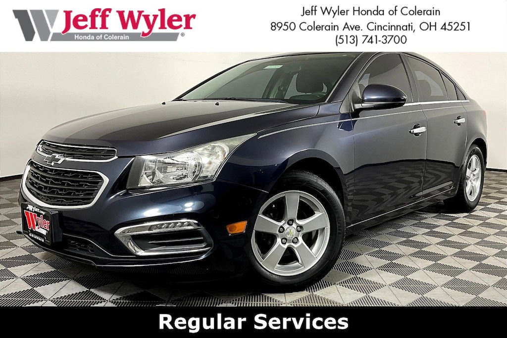 Jeff Wyler Honda of Colerain is honored to offer this fantastic-looking 2016 Chevrolet Cruze Limited 1LT in Blue Ray Metallic. Well equipped with: Preferred Equipment Group 1SD, 16" Painted Aluminum Wheels, 6 Speaker Audio System Feature, 6 Speakers, 6-Way Manual Driver Seat Adjuster, ABS brakes, Air Conditioning, Alloy wheels, AM/FM radio: SiriusXM, AM/FM Stereo w/CD Player/MP3 Playback, Brake assist, Bumpers: body-color, CD player, Compass, Delay-off headlights, Driver door bin, Driver vanity mirror, Dual front impact airbags, Dual front side impact airbags, Electronic Stability Control, Emergency communication system: OnStar, Front anti-roll bar, Front Bucket Seats, Front Center Armrest, Front License Plate Bracket, Front Passenger 6-Way Manual Seat Adjuster, Front reading lights, Front wheel independent suspension, Fully automatic headlights, Illuminated entry, Knee airbag, Low tire pressure warning, Occupant sensing airbag, Outside temperature display, Overhead airbag, Panic alarm, Passenger door bin, Passenger vanity mirror, Power door mirrors, Power steering, Power windows, Premium Cloth Seat Trim, Radio data system, Rear seat center armrest, Rear side impact airbag, Rear window defroster, Remote keyless entry, Security system, SiriusXM Satellite Radio, Speed control, Speed-sensing steering, Split folding rear seat, Steering wheel mounted audio controls, Tachometer, Telescoping steering wheel, Tilt steering wheel, Traction control, Trip computer, Variably intermittent wipers, and Voltmeter.