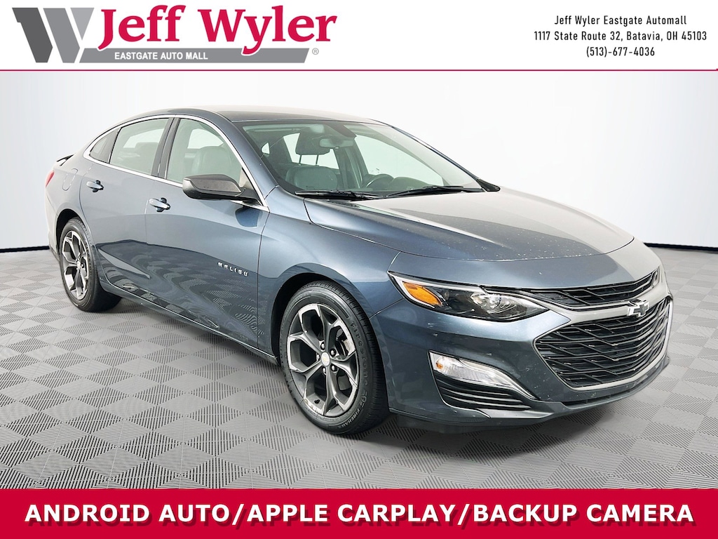 Jeff Wyler Eastgate Auto Mall is excited to offer this superb-looking 2019 Chevrolet Malibu RS in Shadow Gray Metallic. Well equipped with: Preferred Equipment Group 1SP, 4-Wheel Disc Brakes, 6 Speakers, 6-Speaker Audio System Feature, 6-Way Manual Front Passenger Seat Adjuster, 8-Way Power Driver Seat Adjuster, ABS brakes, Air Conditioning, Alloy wheels, AM/FM radio, Apple CarPlay/Android Auto, Brake assist, Bumpers: body-color, Compass, Delay-off headlights, Driver door bin, Driver vanity mirror, Dual front impact airbags, Dual front side impact airbags, Electronic Stability Control, Emergency communication system: OnStar and Chevrolet connected services capable, Exterior Parking Camera Rear, Four wheel independent suspension, Front anti-roll bar, Front Bucket Seats, Front Center Armrest w/Storage, Front License Plate Bracket, Front reading lights, Fully automatic headlights, Illuminated entry, Knee airbag, Leather Shift Knob, Low tire pressure warning, Occupant sensing airbag, Outside temperature display, Overhead airbag, Overhead console, Panic alarm, Passenger door bin, Passenger vanity mirror, Power door mirrors, Power Driver Lumbar Control Seat Adjuster, Power driver seat, Power steering, Power windows, Premium Cloth Seat Trim, Radio: Chevrolet Infotainment 3 System, Rear anti-roll bar, Rear seat center armrest, Rear side impact airbag, Rear window defroster, Remote keyless entry, Remote Start Kit (LPO), Security system, Speed control, Split folding rear seat, Spoiler, Steering wheel mounted audio controls, Tachometer, Telescoping steering wheel, Tilt steering wheel, Traction control, Trip computer, Variably intermittent wipers, and Wheels: 18" Black Chrome Finish Aluminum. Clean CARFAX. Awards: * JD Power Initial Quality Study * 2019 KBB.com 10 Most Comfortable Cars Under $30,000 Ask about available certifications. Used vehicles 10 years of age or newer with less than 100,000 miles are eligible for the Wyler Assurance Program, but eligible vehicles must pass our reconditioning process and multi-point inspection. Provided the vehicle passes inspection, vehicles will be eligible for the 6 month/6,000 mile limited warranty. The 6 month/6,000 mile limited warranty is NOT available on AS-IS vehicles, wholesale vehicles, lease buyback/pass-thru vehicles or un-inspected vehicles. Note that this program can also apply to vehicles where the remaining factory coverage is less than 6 months or 6,000 miles. Please check the Federal Trade Commission (FTC) Buyers guide on the vehicle for full details as to whether or not warranty coverage may apply. Contact Dealer for additional details. The Wyler Assurance 6 month/6,000 Mile limited warranty ends 6 months from the date of the Retail Purchase Agreement (BUYERS ORDER) or when the vehicle's odometer registers 6,000 additional miles to the mileage listed on the BUYERS ORDER, whichever comes first. Your Deductible - The warranty holder on your contract pays the first $100 of each covered repair.