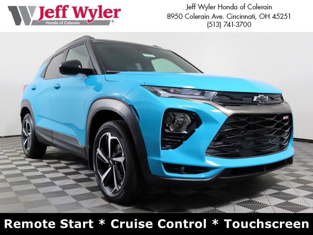 Jeff Wyler Honda of Colerain is excited to offer this handsome 2022 Chevrolet TrailBlazer RS in Oasis Blue. Well equipped with: Preferred Equipment Group 1RS (Heated Steering Wheel), 2-Way Power Driver Lumbar Seat Adjuster, 4-Way Manual Front Passenger Seat Adjuster, 4-Wheel Disc Brakes, 5.45 Axle Ratio, 6 Speakers, 6-Speaker Audio System Feature, 8-Way Power Driver Seat Adjuster, ABS brakes, Air Conditioning, Alloy wheels, AM/FM radio: SiriusXM, Auto High-beam Headlights, Black Front & Rear Splash Guards, Brake assist, Bumpers: body-color, Cloth w/Leatherette Seat Trim, Compass, Delay-off headlights, Driver door bin, Driver vanity mirror, Dual front impact airbags, Dual front side impact airbags, Electronic Stability Control, Emergency communication system: OnStar and Chevrolet connected services capable, Exterior Parking Camera Rear, Flat-Folding Front Passenger Seatback, Front & Rear All-Weather Floor Liners (LPO), Front anti-roll bar, Front Bucket Seats, Front Center Armrest, Front fog lights, Front License Plate Bracket, Front reading lights, Front wheel independent suspension, Fully automatic headlights, Heated door mirrors, Heated Driver & Front Passenger Seats, Heated front seats, Heated steering wheel, Illuminated entry, Knee airbag, Leather Shift Knob, Leather steering wheel, Low tire pressure warning, Mosaic Black Metallic Two-Tone Roof, Occupant sensing airbag, Overhead airbag, Overhead console, Panic alarm, Passenger door bin, Passenger vanity mirror, Power door mirrors, Power driver seat, Power steering, Power windows, Radio data system, Radio: Chevrolet Infotainment 3 System, Rear seat center armrest, Rear side impact airbag, Rear window defroster, Rear window wiper, Remote keyless entry, Ride & Handling Suspension, Roof rack: rails only, Security system, SiriusXM Radio, Speed control, Split folding rear seat, Spoiler, Steering wheel mounted audio controls, Tachometer, Telescoping steering wheel, Tilt steering wheel, Traction control, Trip computer, Variably intermittent wipers, Wheels: 18" High Gloss Black Machined Aluminum, and Wireless Apple CarPlay/Android Auto.