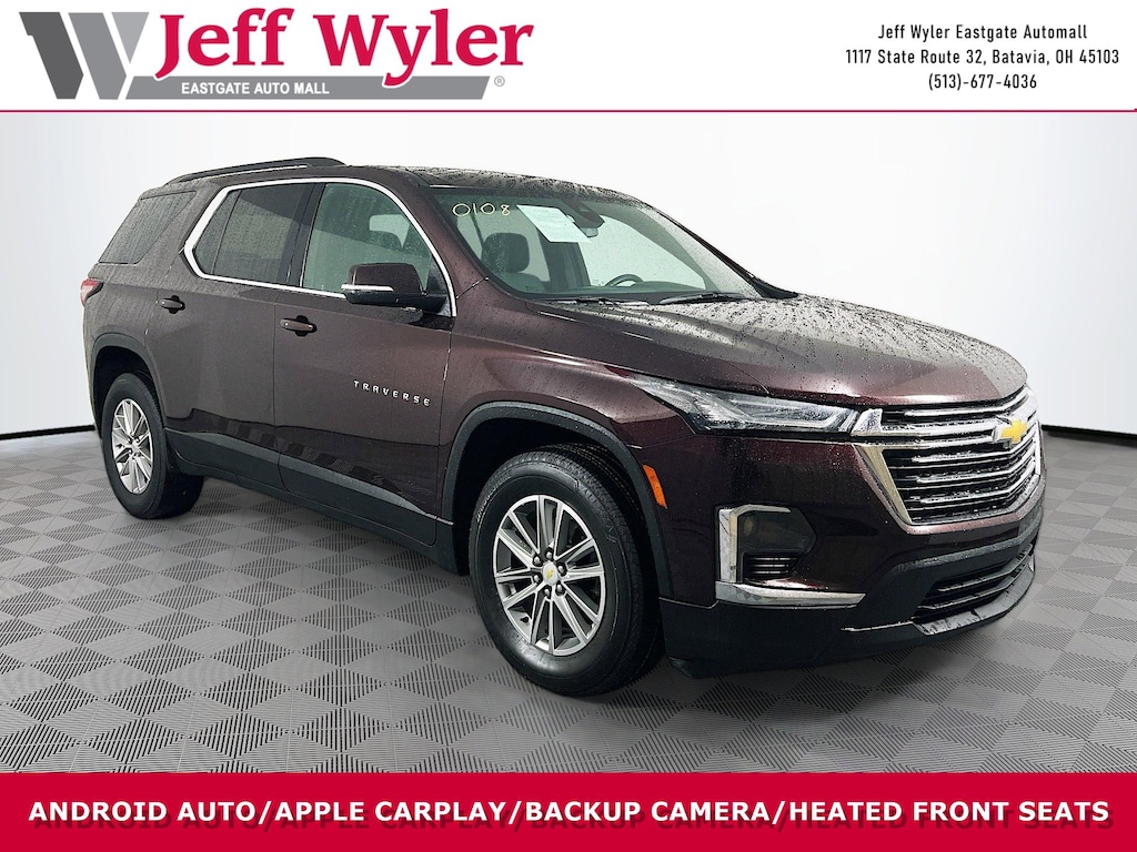 Jeff Wyler Eastgate Auto Mall is honored to offer this gorgeous 2023 Chevrolet Traverse LT in Black Cherry Metallic. Well equipped with: Convenience & Driver Confidence Package (4.2" Multi-Color Enhanced Driver Instrument Display, Heated Driver & Front Passenger Seats, Radio: Chevrolet Infotainment 3 Plus System, Rear Power Liftgate, Remote Start, SiriusXM w/360L, and Universal Home Remote), Preferred Equipment Group 1LT, Trailering Equipment (Heavy-Duty Cooling System and Trailering Assist Guidelines), 2-Way Manual Front Passenger Seat Adjuster, 3.49 Axle Ratio, 3rd row seats: split-bench, 4-Wheel Disc Brakes, 6 Speakers, 6-Speaker Audio System Feature, 8-Way Power Driver Seat Adjuster, ABS brakes, Air Conditioning, Alloy wheels, AM/FM radio: SiriusXM, Apple CarPlay/Android Auto, Auto High-beam Headlights, Automatic temperature control, Black Roof Rails, Brake assist, Bumpers: body-color, Compass, Delay-off headlights, Driver door bin, Driver vanity mirror, Dual front impact airbags, Dual front side impact airbags, Electronic Stability Control, Emergency communication system, Exterior Parking Camera Rear, Four wheel independent suspension, Front anti-roll bar, Front Bucket Seats, Front Center Armrest, Front dual zone A/C, Front reading lights, Fully automatic headlights, Heated door mirrors, Hitch Guidance w/Hitch View, Illuminated entry, Leather steering wheel, Low tire pressure warning, Not Equipped w/Rear Park Assist (060), Occupant sensing airbag, Outside temperature display, Overhead airbag, Overhead console, Panic alarm, Passenger door bin, Passenger vanity mirror, Power door mirrors, Power Driver Lumbar Control, Power driver seat, Power steering, Power windows, Premium Cloth Seat Trim, Radio data system, Radio: Chevrolet Infotainment System AM/FM Stereo, Rear air conditioning, Rear anti-roll bar, Rear reading lights, Rear window defroster, Rear window wiper, Remote keyless entry, Security system, SiriusXM Radio, Speed control, Speed-sensing steering, Spoiler, Steering wheel mounted audio controls, Tachometer, Telescoping steering wheel, Tilt steering wheel, Traction control, Trip computer, Turn signal indicator mirrors, Variably intermittent wipers, Voltmeter, and Wheels: 18" Bright Silver-Painted Aluminum. Clean CARFAX. Ask about available certifications. Used vehicles 10 years of age or newer with less than 100,000 miles are eligible for the Wyler Assurance Program, but eligible vehicles must pass our reconditioning process and multi-point inspection. Provided the vehicle passes inspection, vehicles will be eligible for the 6 month/6,000 mile limited warranty. The 6 month/6,000 mile limited warranty is NOT available on AS-IS vehicles, wholesale vehicles, lease buyback/pass-thru vehicles or un-inspected vehicles. Note that this program can also apply to vehicles where the remaining factory coverage is less than 6 months or 6,000 miles. Please check the Federal Trade Commission (FTC) Buyers guide on the vehicle for full details as to whether or not warranty coverage may apply. Contact Dealer for additional details. The Wyler Assurance 6 month/6,000 Mile limited warranty ends 6 months from the date of the Retail Purchase Agreement (BUYERS ORDER) or when the vehicle's odometer registers 6,000 additional miles to the mileage listed on the BUYERS ORDER, whichever comes first. Your Deductible - The warranty holder on your contract pays the first $100 of each covered repair.