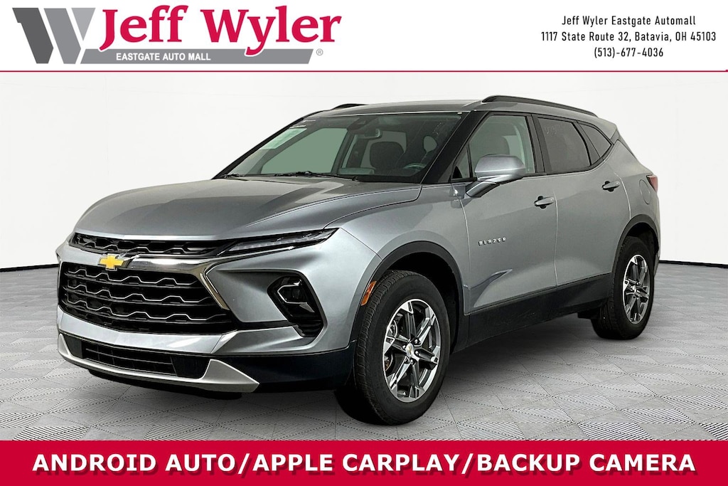 Jeff Wyler Eastgate Auto Mall is proud to offer this gorgeous 2024 Chevrolet Blazer LT in Sterling Gray Metallic. Well equipped with: Convenience Package (Adaptive Cruise Control, Black Roof-Mounted Side Rails, Enhanced Automatic Emergency Braking, Inside Rear-View Auto-Dimming Mirror, Rear Power Programmable Liftgate, Universal Home Remote, and Wireless Charging), Driver Confidence Package (Lane Change Alert w/Side Blind Zone Alert, Rear Cross Traffic Alert, and Rear Park Assist w/Audible Warning), Floor Liner Package (LPO) (1st & 2nd Row All-Weather Floor Liners (LPO) and Integrated Cargo Liner (LPO)), Preferred Equipment Group 2LT, 170 Amp Alternator, 3.47 Final Drive Axle Ratio, 4-Way Manual Front Passenger Seat Adjuster, 4-Wheel Disc Brakes, 6 Speakers, 6-Speaker Audio System Feature, 8-Way Power Driver Seat Adjuster, ABS brakes, Air Conditioning, Alloy wheels, AM/FM radio: SiriusXM with 360L, Apple CarPlay/Android Auto, Auto High-beam Headlights, Automatic temperature control, Brake assist, Bumpers: body-color, Child-Seat-Sensing Airbag, Compass, Delay-off headlights, Driver door bin, Driver vanity mirror, Dual front impact airbags, Dual front side impact airbags, Electronic Stability Control, Emergency communication system: OnStar and Chevrolet connected services capable, Four wheel independent suspension, Front anti-roll bar, Front Bucket Seats, Front Center Armrest, Front dual zone A/C, Front reading lights, Fully automatic headlights, Heated door mirrors, Heated Driver & Front Passenger Seats, Heated front seats, Illuminated entry, Knee airbag, Leather Shift Knob, Low tire pressure warning, Not Equipped w/Rear Park Assist, Occupant sensing airbag, Outside temperature display, Overhead airbag, Overhead console, Panic alarm, Passenger door bin, Passenger vanity mirror, Power door mirrors, Power Driver Lumbar Control, Power driver seat, Power steering, Power windows, Premium audio system: Chevrolet Infotainment 3 Plus, Premium Cloth Seat Trim, Radio data system, Radio: Chevrolet Infotainment 3 Plus System, Rear anti-roll bar, Rear reading lights, Rear seat center armrest, Rear window defroster, Rear window wiper, Remote keyless entry, Ride & Handling Suspension, Security system, SiriusXM w/360L, Speed control, Speed-sensing steering, Split folding rear seat, Spoiler, Steering wheel mounted audio controls, Tachometer, Telescoping steering wheel, Tilt steering wheel, Traction control, Trip computer, Variably intermittent wipers, Voltmeter, and Wheels: 18" Grazen Metallic Aluminum. Clean CARFAX. Ask about available certifications. Used vehicles 10 years of age or newer with less than 100,000 miles are eligible for the Wyler Assurance Program, but eligible vehicles must pass our reconditioning process and multi-point inspection. Provided the vehicle passes inspection, vehicles will be eligible for the 6 month/6,000 mile limited warranty. The 6 month/6,000 mile limited warranty is NOT available on AS-IS vehicles, wholesale vehicles, lease buyback/pass-thru vehicles or un-inspected vehicles. Note that this program can also apply to vehicles where the remaining factory coverage is less than 6 months or 6,000 miles. Please check the Federal Trade Commission (FTC) Buyers guide on the vehicle for full details as to whether or not warranty coverage may apply. Contact Dealer for additional details. The Wyler Assurance 6 month/6,000 Mile limited warranty ends 6 months from the date of the Retail Purchase Agreement (BUYERS ORDER) or when the vehicle's odometer registers 6,000 additional miles to the mileage listed on the BUYERS ORDER, whichever comes first. Your Deductible - The warranty holder on your contract pays the first $100 of each covered repair.