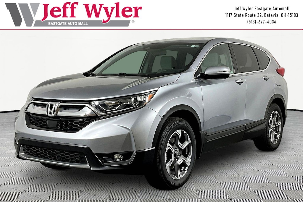 Jeff Wyler Eastgate Auto Mall is pleased to offer this terrific-looking 2019 Honda CR-V EX in Silver. Well equipped with: 18" Alloy Wheels, 4-Wheel Disc Brakes, 5.64 Axle Ratio, 6 Speakers, ABS brakes, Air Conditioning, Alloy wheels, AM/FM radio: SiriusXM, Apple CarPlay/Android Auto, Auto High-beam Headlights, Automatic temperature control, Blind Spot Information (BSI) System warning, Brake assist, Bumpers: body-color, Cloth Seat Trim, Compass, Delay-off headlights, Driver door bin, Driver vanity mirror, Dual front impact airbags, Dual front side impact airbags, Electronic Stability Control, Exterior Parking Camera Rear, Forward collision: Collision Mitigation Braking System (CMBS) + FCW mitigation, Four wheel independent suspension, Front anti-roll bar, Front Bucket Seats, Front Center Armrest, Front dual zone A/C, Front fog lights, Front reading lights, Fully automatic headlights, Heated door mirrors, Heated Front Bucket Seats, Heated front seats, Illuminated entry, Lane departure: Lane Keeping Assist System (LKAS) active, Low tire pressure warning, Occupant sensing airbag, Outside temperature display, Overhead airbag, Overhead console, Panic alarm, Passenger door bin, Passenger vanity mirror, Power door mirrors, Power driver seat, Power moonroof, Power steering, Power windows, Radio data system, Radio: AM/FM Audio System w/6 Speakers, Rear anti-roll bar, Rear seat center armrest, Rear window defroster, Rear window wiper, Remote keyless entry, Security system, Speed control, Speed-sensing steering, Speed-Sensitive Wipers, Split folding rear seat, Spoiler, Steering wheel mounted audio controls, Tachometer, Telescoping steering wheel, Tilt steering wheel, Traction control, Trip computer, Turn signal indicator mirrors, and Variably intermittent wipers. Ask about available certifications. Used vehicles 10 years of age or newer with less than 100,000 miles are eligible for the Wyler Assurance Program, but eligible vehicles must pass our reconditioning process and multi-point inspection. Provided the vehicle passes inspection, vehicles will be eligible for the 6 month/6,000 mile limited warranty. The 6 month/6,000 mile limited warranty is NOT available on AS-IS vehicles, wholesale vehicles, lease buyback/pass-thru vehicles or un-inspected vehicles. Note that this program can also apply to vehicles where the remaining factory coverage is less than 6 months or 6,000 miles. Please check the Federal Trade Commission (FTC) Buyers guide on the vehicle for full details as to whether or not warranty coverage may apply. Contact Dealer for additional details. The Wyler Assurance 6 month/6,000 Mile limited warranty ends 6 months from the date of the Retail Purchase Agreement (BUYERS ORDER) or when the vehicle's odometer registers 6,000 additional miles to the mileage listed on the BUYERS ORDER, whichever comes first. Your Deductible - The warranty holder on your contract pays the first $100 of each covered repair.