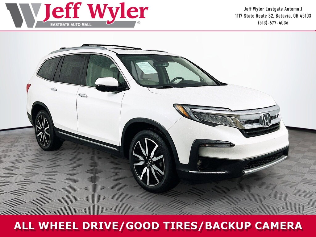 Jeff Wyler Eastgate Auto Mall is honored to offer this great-looking 2020 Honda Pilot Elite in White. Well equipped with: 10 Speakers, 3rd row seats: split-bench, 4-Wheel Disc Brakes, 4.334 Axle Ratio, A/V remote: CabinControl, ABS brakes, Air Conditioning, Alloy wheels, AM/FM radio: SiriusXM, Apple CarPlay/Android Auto, Auto High-beam Headlights, Auto-dimming door mirrors, Auto-dimming Rear-View mirror, Automatic temperature control, Blind Spot Information (BSI) System warning, Brake assist, Bumpers: body-color, Compass, Delay-off headlights, Driver door bin, Driver vanity mirror, Dual front impact airbags, Dual front side impact airbags, Electronic Stability Control, Emergency communication system: HondaLink, Exterior Parking Camera Rear, Forward collision: Collision Mitigation Braking System (CMBS) + FCW mitigation, Four wheel independent suspension, Front anti-roll bar, Front Bucket Seats, Front Center Armrest, Front dual zone A/C, Front fog lights, Front reading lights, Fully automatic headlights, Garage door transmitter: HomeLink, Headphones, Heated & Ventilated Front Bucket Seats, Heated door mirrors, Heated front seats, Heated rear seats, Heated steering wheel, Honda Satellite-Linked Navigation System, Illuminated entry, Lane departure: Lane Keeping Assist System (LKAS) active, Low tire pressure warning, Memory seat, Navigation system: Honda Satellite-Linked Navigation System, Occupant sensing airbag, Outside temperature display, Overhead airbag, Overhead console, Panic alarm, Passenger door bin, Passenger vanity mirror, Perforated Leather Seat Trim, Power door mirrors, Power driver seat, Power Liftgate, Power moonroof, Power passenger seat, Power steering, Power windows, Radio data system, Radio: 590-Watt Premium Audio System, Rain sensing wipers, Rear air conditioning, Rear anti-roll bar, Rear audio controls, Rear reading lights, Rear window defroster, Rear window wiper, Reclining 3rd row seat, Remote keyless entry, Roof rack: rails only, Security system, Speed control, Speed-sensing steering, Speed-Sensitive Wipers, Split folding rear seat, Spoiler, Steering wheel mounted audio controls, Tachometer, Telescoping steering wheel, Tilt steering wheel, Traction control, Trip computer, Turn signal indicator mirrors, Variably intermittent wipers, Ventilated front seats, and Wheels: 20" Machine-Finished Alloy. CARFAX One-Owner. Clean CARFAX. Ask about available certifications. Used vehicles 10 years of age or newer with less than 100,000 miles are eligible for the Wyler Assurance Program, but eligible vehicles must pass our reconditioning process and multi-point inspection. Provided the vehicle passes inspection, vehicles will be eligible for the 6 month/6,000 mile limited warranty. The 6 month/6,000 mile limited warranty is NOT available on AS-IS vehicles, wholesale vehicles, lease buyback/pass-thru vehicles or un-inspected vehicles. Note that this program can also apply to vehicles where the remaining factory coverage is less than 6 months or 6,000 miles. Please check the Federal Trade Commission (FTC) Buyers guide on the vehicle for full details as to whether or not warranty coverage may apply. Contact Dealer for additional details. The Wyler Assurance 6 month/6,000 Mile limited warranty ends 6 months from the date of the Retail Purchase Agreement (BUYERS ORDER) or when the vehicle's odometer registers 6,000 additional miles to the mileage listed on the BUYERS ORDER, whichever comes first. Your Deductible - The warranty holder on your contract pays the first $100 of each covered repair.