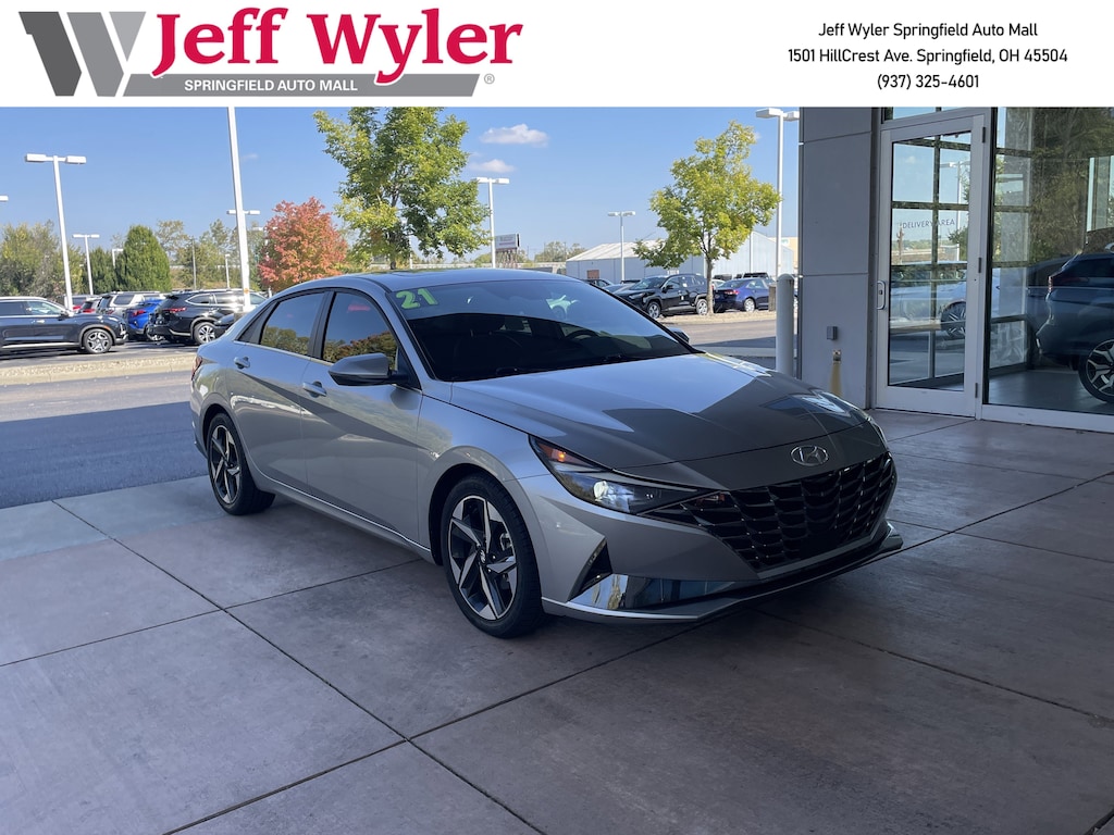 Jeff Wyler Springfield Auto Mall is excited to offer this beautiful 2021 Hyundai Elantra Limited in Shimmering Silver Pearl. Well equipped with: Option Group 01, 17" x 7.0J Alloy Wheels, 4-Wheel Disc Brakes, 8 Speakers, ABS brakes, Air Conditioning, Alloy wheels, AM/FM radio: SiriusXM, Apple CarPlay & Android Auto, Auto High-beam Headlights, Auto-dimming Rear-View mirror, Automatic temperature control, Brake assist, Bumpers: body-color, Cargo Net, Carpeted Floor Mats, Delay-off headlights, Driver door bin, Driver vanity mirror, Dual front impact airbags, Dual front side impact airbags, Electronic Stability Control, Emergency communication system: Blue Link Connected Car Service (3-year complimentary subscription), Exterior Parking Camera Rear, Front anti-roll bar, Front Bucket Seats, Front Center Armrest, Front dual zone A/C, Front reading lights, Front wheel independent suspension, Fully automatic headlights, Garage door transmitter: HomeLink, Heated door mirrors, Heated Front Bucket Seats, Heated front seats, Illuminated entry, Leather-Trimmed Seats, Low tire pressure warning, Navigation System, Occupant sensing airbag, Outside temperature display, Overhead airbag, Overhead console, Panic alarm, Passenger door bin, Passenger vanity mirror, Power door mirrors, Power driver seat, Power moonroof, Power steering, Power windows, Radio: AM/FM/HD/SiriusXM Display Audio, Rear Bumper Applique, Rear seat center armrest, Rear window defroster, Remote keyless entry, Security system, Speed control, Speed-sensing steering, Split folding rear seat, Steering wheel mounted audio controls, Tachometer, Telescoping steering wheel, Tilt steering wheel, Traction control, Trip computer, Turn signal indicator mirrors, and Variably intermittent wipers. Awards: * NACTOY 2021 North American Car of the Year Ask about available certifications. Used vehicles 10 years of age or newer with less than 100,000 miles are eligible for the Wyler Assurance Program, but eligible vehicles must pass our reconditioning process and multi-point inspection. Provided the vehicle passes inspection, vehicles will be eligible for the 6 month/6,000 mile limited warranty. The 6 month/6,000 mile limited warranty is NOT available on AS-IS vehicles, wholesale vehicles, lease buyback/pass-thru vehicles or un-inspected vehicles. Note that this program can also apply to vehicles where the remaining factory coverage is less than 6 months or 6,000 miles. Please check the Federal Trade Commission (FTC) Buyers guide on the vehicle for full details as to whether or not warranty coverage may apply. Contact Dealer for additional details. The Wyler Assurance 6 month/6,000 Mile limited warranty ends 6 months from the date of the Retail Purchase Agreement (BUYERS ORDER) or when the vehicle's odometer registers 6,000 additional miles to the mileage listed on the BUYERS ORDER, whichever comes first. Your Deductible - The warranty holder on your contract pays the first $100 of each covered repair.