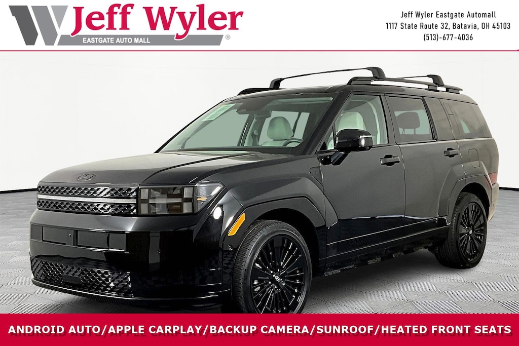 Jeff Wyler Eastgate Auto Mall is excited to offer this good-looking 2026 Hyundai Santa Fe Hybrid Calligraphy in Phantom Black. Well equipped with: Option Group 01, 12 Speakers, 3rd row seats: bench, 4-Wheel Disc Brakes, ABS brakes, Air Conditioning, Alloy wheels, AM/FM radio: SiriusXM, Apple CarPlay & Android Auto, Auto High-beam Headlights, Auto-dimming Rear-View mirror, Automatic temperature control, Brake assist, Bumpers: body-color, Cargo Cover/Screen, Cargo Net, Cargo Tray, Carpeted Floor Mats, Delay-off headlights, Driver door bin, Driver vanity mirror, Dual front impact airbags, Dual front side impact airbags, Electronic Stability Control, Emergency communication system, Exterior Parking Camera Rear, First Aid Kit, Four wheel independent suspension, Front anti-roll bar, Front Bucket Seats, Front Center Armrest, Front dual zone A/C, Front reading lights, Fully automatic headlights, Garage door transmitter: HomeLink, Heads-Up Display, Heated and Ventilated Front Bucket Seats, Heated door mirrors, Heated front seats, Heated rear seats, Heated steering wheel, Illuminated entry, Knee airbag, Leather steering wheel, Low tire pressure warning, Memory seat, Navigation System, Occupant sensing airbag, Outside temperature display, Overhead airbag, Overhead console, Panic alarm, Passenger door bin, Passenger vanity mirror, Power door mirrors, Power driver seat, Power Liftgate, Power moonroof, Power passenger seat, Power steering, Power windows, Quilted Premium Nappa Leather Seat Trim, Radio: AM/FM/HD Bose Premium Audio System, Rain sensing wipers, Rear anti-roll bar, Rear side impact airbag, Rear window defroster, Rear window wiper, Remote keyless entry, Roof Rack Crossbars, Security system, Speed control, Speed-sensing steering, Split folding rear seat, Spoiler, Steering wheel mounted audio controls, Tachometer, Telescoping steering wheel, Tilt steering wheel, Traction control, Trip computer, Turn signal indicator mirrors, Variably intermittent wipers, Ventilated front seats, and Wheels: 20" x 8.5J Unique Dark Finish Alloy. CARFAX One-Owner. Ask about available certifications. Used vehicles 10 years of age or newer with less than 100,000 miles are eligible for the Wyler Assurance Program, but eligible vehicles must pass our reconditioning process and multi-point inspection. Provided the vehicle passes inspection, vehicles will be eligible for the 6 month/6,000 mile limited warranty. The 6 month/6,000 mile limited warranty is NOT available on AS-IS vehicles, wholesale vehicles, lease buyback/pass-thru vehicles or un-inspected vehicles. Note that this program can also apply to vehicles where the remaining factory coverage is less than 6 months or 6,000 miles. Please check the Federal Trade Commission (FTC) Buyers guide on the vehicle for full details as to whether or not warranty coverage may apply. Contact Dealer for additional details. The Wyler Assurance 6 month/6,000 Mile limited warranty ends 6 months from the date of the Retail Purchase Agreement (BUYERS ORDER) or when the vehicle's odometer registers 6,000 additional miles to the mileage listed on the BUYERS ORDER, whichever comes first. Your Deductible - The warranty holder on your contract pays the first $100 of each covered repair.