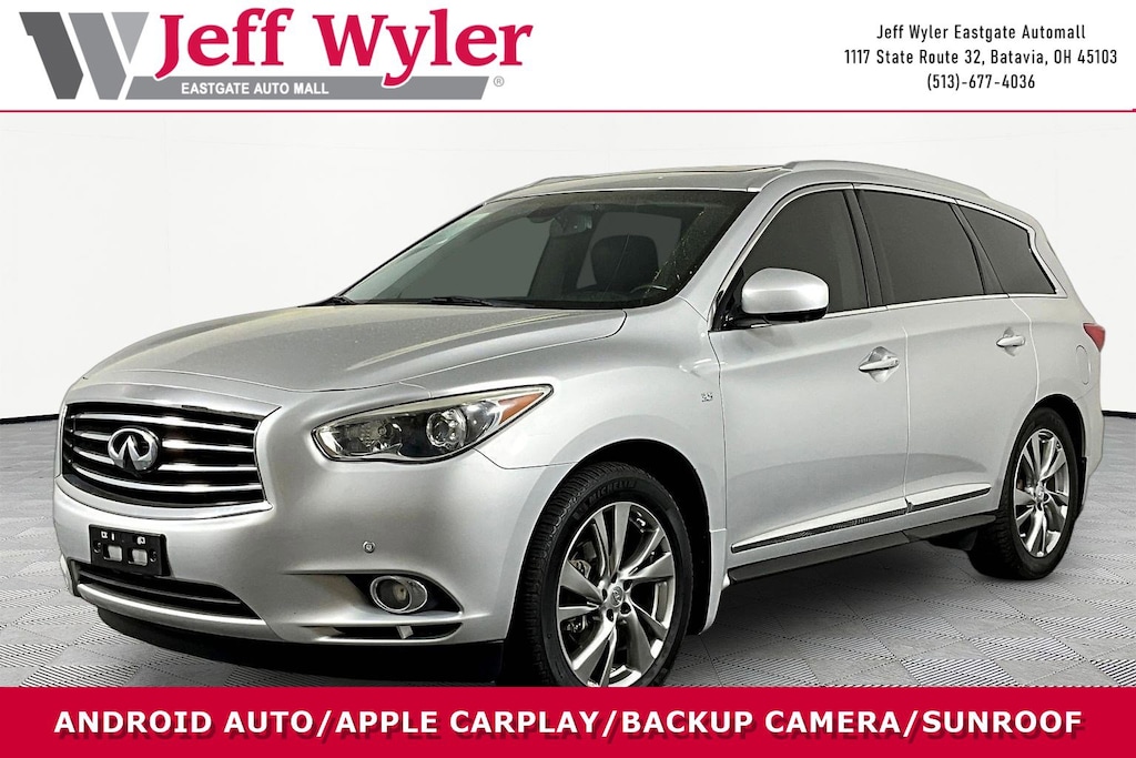 Jeff Wyler Eastgate Auto Mall is delighted to offer this terrific-looking 2015 INFINITI QX60 in Liquid Platinum. Well equipped with: Deluxe Touring Package (20" Split 5-Spoke Aluminum-Alloy Wheels, Advanced Climate Control System, Bose Cabin Surround Sound System, Climate-Controlled Front Seats, Heated 2nd-Row Seats, Power Return Third Row Seat Back, and Second & Third-Row Moonroof w/Power Rear Sunshade), Maple Accents Package (Maple Interior Accents), Premium Package (2-Way Driver's Seat Power Lumbar Support, Dual Occupant Memory System, Enhanced Intelligent Key Memory, Entry & Exit Assist, Heated Steering Wheel, Outside Mirrors w/Reverse Tilt-Down Feature, Radio: AM/FM/CD/DVD w/MP3 Playback Capability, and Remote Engine Start), Premium Plus Package (Around View Monitor w/Front & Rear Sonar System, INFINITI Navigation System, INFINITI Voice Recognition, Rain-Sensing Front Windshield Wipers, and Single In-Dash CD Player), Technology Package (Active Trace Control, Back-Up Collision Intervention (BCI), Blind Spot Intervention (BSI), Blind Spot Warning System (BSW), Distance Control Assist, ECO Pedal, Front Pre-Crash Seatbelts, Intelligent Brake Assist (IBA), Intelligent Cruise Control, Lane Departure Prevention (LDP), and Lane Departure Warning System), Theater Package (120V Power Outlet, Dual 7" Color Monitors, and Wireless Headphones (2)), 18" 5-Spoke Aluminum Alloy Wheels, 3rd row seats: bench, 4-Wheel Disc Brakes, 5.17 Axle Ratio, 6 Speakers, ABS brakes, Activation Disclaimer, Air Conditioning, Alloy wheels, AM/FM radio: SiriusXM, AM/FM/CD/MP3 Audio System, Auto-dimming Rear-View mirror, Automatic temperature control, Bodyside moldings, Brake assist, Bumpers: body-color, CD player, Delay-off headlights, Driver door bin, Driver vanity mirror, Dual front impact airbags, Dual front side impact airbags, Electronic Stability Control, Floor Mats, Four wheel independent suspension, Front anti-roll bar, Front Bucket Seats, Front Center Armrest w/Storage, Front dual zone A/C, Front fog lights, Front reading lights, Fully automatic headlights, Garage door transmitter, Heated door mirrors, Heated Front Seats, Heated front seats, High intensity discharge headlights: Bi-Xenon, Illuminated entry, Illuminated Kick Plates, Illuminated Kick Plates (PIO), Leather Shift Knob, Leather steering wheel, Leather-Appointed Seats, Literature Kit, Low tire pressure warning, Occupant sensing airbag, Outside temperature display, Overhead airbag, Overhead console, Panic alarm, Passenger door bin, Passenger vanity mirror, Power door mirrors, Power driver seat, Power Liftgate, Power moonroof, Power passenger seat, Power steering, Power windows, Radio data system, Rear air conditioning, Rear anti-roll bar, Rear reading lights, Rear seat center armrest, Rear window defroster, Rear window wiper, Reclining 3rd row seat, Remote keyless entry, Roof Rails, Security system, Speed control, Speed-sensing steering, Speed-Sensitive Wipers, Splash Guards (Color-Matched Set of 4), Split folding rear seat, Spoiler, Steering wheel mounted audio controls, Tachometer, Telescoping steering wheel, Tilt steering wheel, Traction control, Trip computer, and Variably intermittent wipers. Clean CARFAX. Reviews: * Ample passenger room in all three rows; smooth and quiet ride; classy interior design; user-friendly electronics interface. Source: EdmundsAwards: * 2015 IIHS Top Safety Pick Ask about available certifications. Used vehicles 10 years of age or newer with less than 100,000 miles are eligible for the Wyler Assurance Program, but eligible vehicles must pass our reconditioning process and multi-point inspection. Provided the vehicle passes inspection, vehicles will be eligible for the 6 month/6,000 mile limited warranty. The 6 month/6,000 mile limited warranty is NOT available on AS-IS vehicles, wholesale vehicles, lease buyback/pass-thru vehicles or un-inspected vehicles. Note that this program can also apply to vehicles where the remaining factory coverage is less than