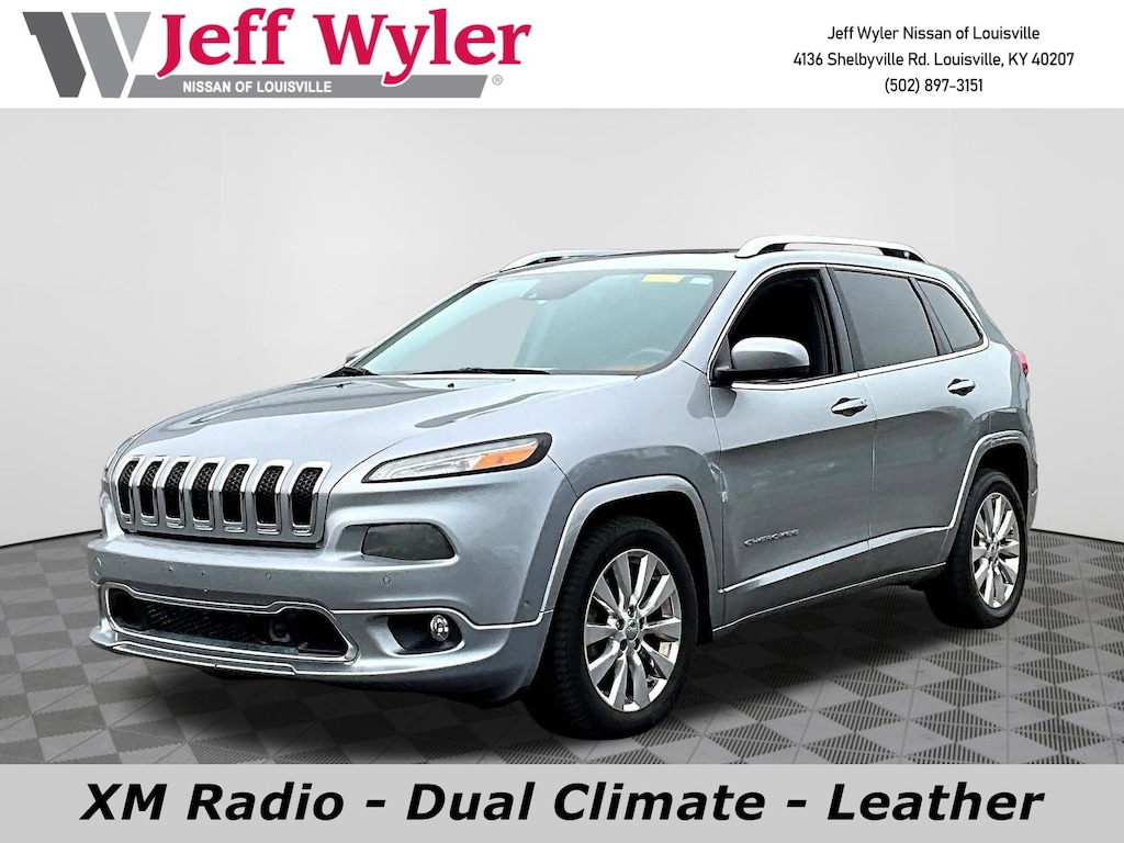 Jeff Wyler Nissan of Louisville is pumped up to offer this superb 2016 Jeep Cherokee Overland in Billet Silver Metallic Clearcoat. ** BLUETOOTH **, ** NAVIGATION **, ** BACKUP CAMERA **, ** LEATHER INTERIOR **, ** HEATED SEATS **, ** PUSH-BUTTON START **, ** 6-CYLINDER ENGINE **, ** GREAT FUEL ECONOMY **, ** EXCELLENT SERVICE HISTORY **, ** LOCALLY OWNED **, and ** HOME DELIVERY OPTIONS! ** Quick Order Package 26M, Technology Group (Adaptive Cruise Control w/Stop & Go, Advanced Brake Assist, Auto High Beam Headlamp Control, Exterior Mirrors Courtesy Lamps, Exterior Mirrors w/Supplemental Signals, Full Speed FWD Collision Warn Plus, Lane Departure Warning Plus, Parallel & Perp Park Assist w/Stop, and Rain Sensitive Windshield Wipers), 10 Speakers, 4-Wheel Disc Brakes, 600 Amp Maintenance Free Battery, ABS brakes, Active Grille Shutters, Air Conditioning, Alloy wheels, AM/FM radio: SiriusXM, Anti-whiplash front head restraints, Audio memory, Auto-dimming Rear-View mirror, Automatic temperature control, Brake assist, Bumpers: body-color, Compass, Delay-off headlights, Driver door bin, Driver vanity mirror, Dual front impact airbags, Dual front side impact airbags, Electronic Stability Control, Emergency communication system, Engine Oil Cooler, Four wheel independent suspension, Front anti-roll bar, Front Bucket Seats, Front Center Armrest, Front dual zone A/C, Front fog lights, Front reading lights, Fully automatic headlights, Garage door transmitter, Heated door mirrors, Heated front seats, Heated steering wheel, High intensity discharge headlights: Bi-Xenon, Illuminated entry, Knee airbag, Leather Shift Knob, Leather steering wheel, Low tire pressure warning, Memory seat, Navigation System, Normal Duty Suspension, Occupant sensing airbag, Outside temperature display, Overhead airbag, Overhead console, Panic alarm, ParkView Rear Back-Up Camera, Passenger door bin, Passenger vanity mirror, Power door mirrors, Power driver seat, Power Front/Fixed Rear Full Sunroof, Power Liftgate, Power passenger seat, Power steering, Power windows, Premium Leather Trimmed Bucket Seats, Radio data system, Radio: Uconnect 8.4 NAV, Rear anti-roll bar, Rear reading lights, Rear seat center armrest, Rear side impact airbag, Rear window defroster, Rear window wiper, Remote keyless entry, Roof rack: rails only, Security system, Speed control, Speed-sensing steering, Split folding rear seat, Spoiler, Steering wheel mounted audio controls, Tachometer, Telescoping steering wheel, Tilt steering wheel, Tonneau Cover, Traction control, Trip computer, Turn signal indicator mirrors, Variably intermittent wipers, Ventilated front seats, Voltmeter, and Wheels: 18" x 7" Polished Aluminum Our PRE-OWNED vehicles are put through a rigorous 167- POINT QUALITY ASSURANCE INSPECTION along with an average amount of over $1,400.00 SPENT to recondition each vehicle so we can be sure to deliver you the highest quality vehicle like you deserve! ***ONLINE PRICE DOES NOT INCLUDE WYLER FAMILY FIRST PACKAGE*** Stop by 4136 Shelbyville Road to see for yourself, or give us a call @ 502-897-3151 to schedule your test drive! ** BLUETOOTH **, ** NAVIGATION **, ** BACKUP CAMERA **, ** LEATHER INTERIOR **, ** HEATED SEATS **, ** PUSH-BUTTON START **, ** 6-CYLINDER ENGINE **, ** GREAT FUEL ECONOMY **, ** EXCELLENT SERVICE HISTORY **, ** LOCALLY OWNED **, 10 Speakers, 4-Wheel Disc Brakes, 600 Amp Maintenance Free Battery, ABS brakes, Active Grille Shutters, Adaptive Cruise Control w/Stop & Go, Advanced Brake Assist, Air Conditioning, Alloy wheels, AM/FM radio: SiriusXM, Anti-whiplash front head restraints, Audio memory, Auto High Beam Headlamp Control, Auto-dimming Rear-View mirror, Automatic temperature control, Brake assist, Bumpers: body-color, Compass, Delay-off headlights, Driver door bin, Driver vanity mirror, Dual front impact airbags, Dual front side impact airbags, Electronic Stability Control, Emergency communication system, Engine Oil Cooler, Exterior Mirrors Courtesy Lamps, Ex