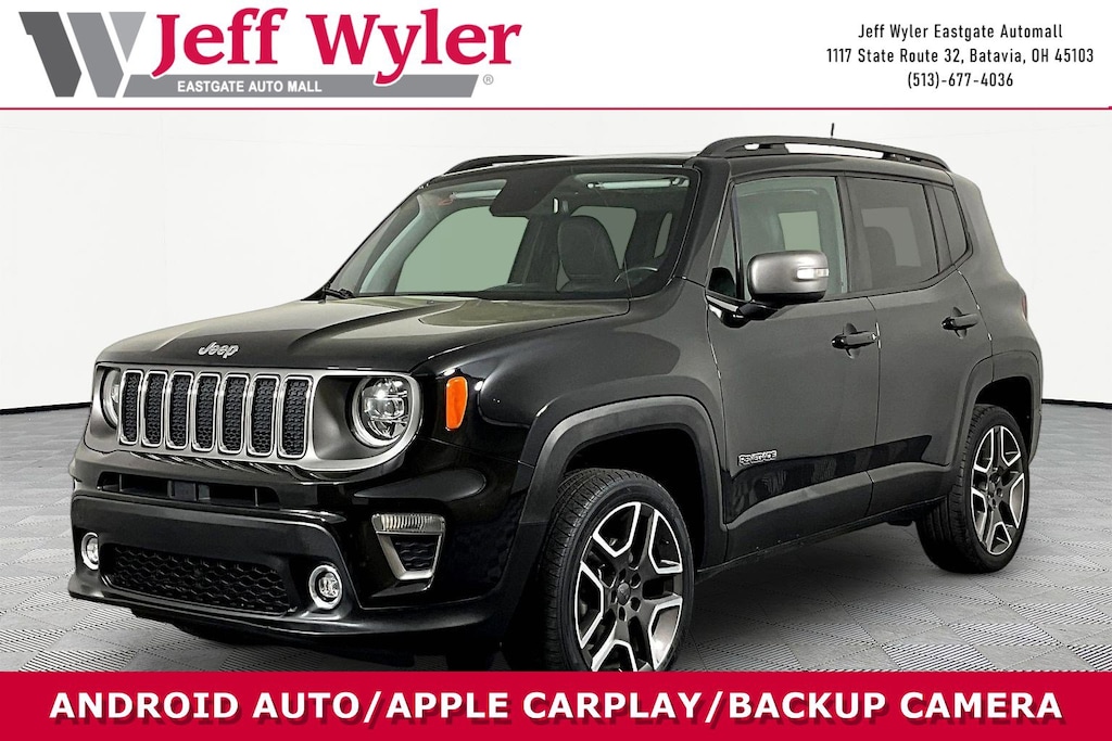 Jeff Wyler Eastgate Auto Mall is very proud to offer this gorgeous 2019 Jeep Renegade Limited in Black Clearcoat. Well equipped with: LED Lighting Group (Bi-Function LED Projector Headlamps, Dedicated LED Daytime Running Lamps, LED Cornering Fog Lamps, and LED Taillamps), Quick Order Package 22D, Safety and Security Group (Blind Spot & Cross Path Detection, Security Alarm, and Tonneau Cover), 3.734 Final Drive Ratio, 4-Wheel Disc Brakes, 6 Speakers, ABS brakes, Air Conditioning, Alloy wheels, AM/FM radio: SiriusXM, Anti-whiplash front head restraints, Apple CarPlay/Android Auto, Auto-dimming Rear-View mirror, Automatic temperature control, Body Color Roof, Brake assist, Compass, Delay-off headlights, Driver door bin, Driver vanity mirror, Dual front impact airbags, Dual front side impact airbags, Electronic Stability Control, Four wheel independent suspension, Front anti-roll bar, Front Bucket Seats, Front Center Armrest, Front dual zone A/C, Front fog lights, Front reading lights, Fully automatic headlights, Heated door mirrors, Heated front seats, Heated steering wheel, Illuminated entry, Knee airbag, Leather Shift Knob, Leather steering wheel, Leather Trimmed Bucket Seats, Low tire pressure warning, My Sky Power/Removable Sunroof, Normal Duty Suspension, Occupant sensing airbag, Outside temperature display, Overhead airbag, Panic alarm, ParkView Rear Back-Up Camera, Passenger door bin, Passenger vanity mirror, Power door mirrors, Power driver seat, Power steering, Power windows, Radio data system, Radio: Uconnect 4 w/7" Display, Rain sensing wipers, Rear anti-roll bar, Rear seat center armrest, Rear window defroster, Rear window wiper, Remote keyless entry, Roof rack: rails only, Speed control, Split folding rear seat, Spoiler, Steering wheel mounted audio controls, Stop-Start Multiple VSM System, Tachometer, Telescoping steering wheel, Tilt steering wheel, Traction control, Trip computer, Turn signal indicator mirrors, Variably intermittent wipers, Voltmeter, Wheels: 18" x 7.0" Painted Aluminum, and Wheels: 19" x 7.5" Aluminum. Clean CARFAX. Ask about available certifications. Used vehicles 10 years of age or newer with less than 100,000 miles are eligible for the Wyler Assurance Program, but eligible vehicles must pass our reconditioning process and multi-point inspection. Provided the vehicle passes inspection, vehicles will be eligible for the 6 month/6,000 mile limited warranty. The 6 month/6,000 mile limited warranty is NOT available on AS-IS vehicles, wholesale vehicles, lease buyback/pass-thru vehicles or un-inspected vehicles. Note that this program can also apply to vehicles where the remaining factory coverage is less than 6 months or 6,000 miles. Please check the Federal Trade Commission (FTC) Buyers guide on the vehicle for full details as to whether or not warranty coverage may apply. Contact Dealer for additional details. The Wyler Assurance 6 month/6,000 Mile limited warranty ends 6 months from the date of the Retail Purchase Agreement (BUYERS ORDER) or when the vehicle's odometer registers 6,000 additional miles to the mileage listed on the BUYERS ORDER, whichever comes first. Your Deductible - The warranty holder on your contract pays the first $100 of each covered repair.