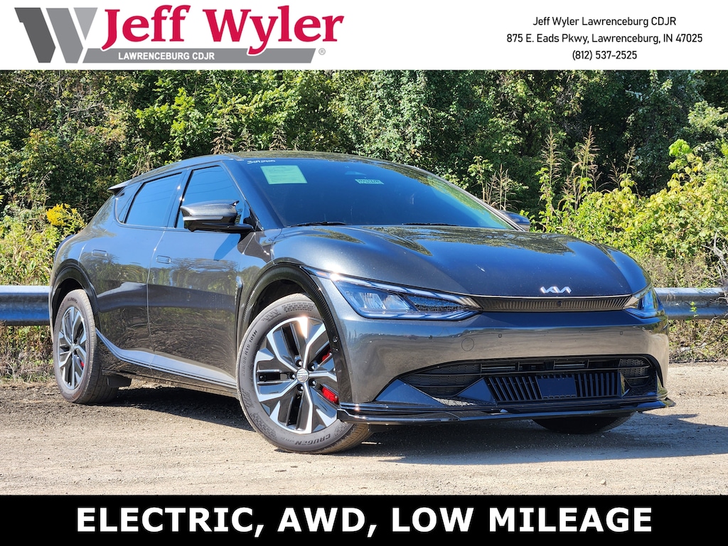 Jeff Wyler Chrysler Dodge Jeep of Lawrenceburg is delighted to offer this wonderful 2022 Kia EV6 Wind in Interstellar Gray. Wind Technology Package (Blind-Spot View Monitor, Remote Smart Parking Assist, Reverse Parking Collision-Avoidance Assist, and Surround View Monitor), 14 Speakers, 4-Wheel Disc Brakes, ABS brakes, Air Conditioning, Alloy wheels, AM/FM radio: SiriusXM, Apple CarPlay & Android Auto, Auto High-beam Headlights, Auto-dimming Rear-View mirror, Automatic temperature control, Axle Ratio: 10.650, Brake assist, Bumpers: body-color, Carpeted Floor Mats, Delay-off headlights, Driver door bin, Driver vanity mirror, Dual front impact airbags, Dual front side impact airbags, Electronic Stability Control, Emergency communication system, Four wheel independent suspension, Front anti-roll bar, Front Bucket Seats, Front Center Armrest, Front dual zone A/C, Front reading lights, Fully automatic headlights, Heated & Ventilated Front Bucket Seats, Heated door mirrors, Heated front seats, Heated rear seats, Heated steering wheel, Illuminated entry, Knee airbag, Low tire pressure warning, Memory seat, Navigation system: AVN 5.0 Navigation System, Occupant sensing airbag, Outside temperature display, Overhead airbag, Overhead console, Panic alarm, Passenger door bin, Passenger vanity mirror, Power door mirrors, Power driver seat, Power Liftgate, Power passenger seat, Power steering, Power windows, Radio: Meridian Premium Audio System, Rain sensing wipers, Rear anti-roll bar, Rear seat center armrest, Rear window defroster, Remote keyless entry, Security system, Smart Key w/ Push Button and Remote Start, Speed control, Speed-sensing steering, Split folding rear seat, Spoiler, Steering wheel mounted audio controls, Telescoping steering wheel, Tilt steering wheel, Traction control, Trip computer, Turn signal indicator mirrors, Variably intermittent wipers, Vegan Leather Seat Trim, Ventilated front seats, and Wheels: 7.5J x 19" Black Painted Alloy Our PRE-OWNED vehicles are put through a rigorous 167- POINT QUALITY ASSURANCE INSPECTION along with an average amount of over $1,400.00 SPENT to recondition each vehicle so we can be sure to deliver you the highest quality vehicle like you deserve! ***ONLINE PRICE DOES NOT INCLUDE WYLER FAMILY FIRST PACKAGE*** Stop by 4136 Shelbyville Road to see for yourself, or give us a call @ 502-897-3151 to schedule your test drive! Ask about available certifications.