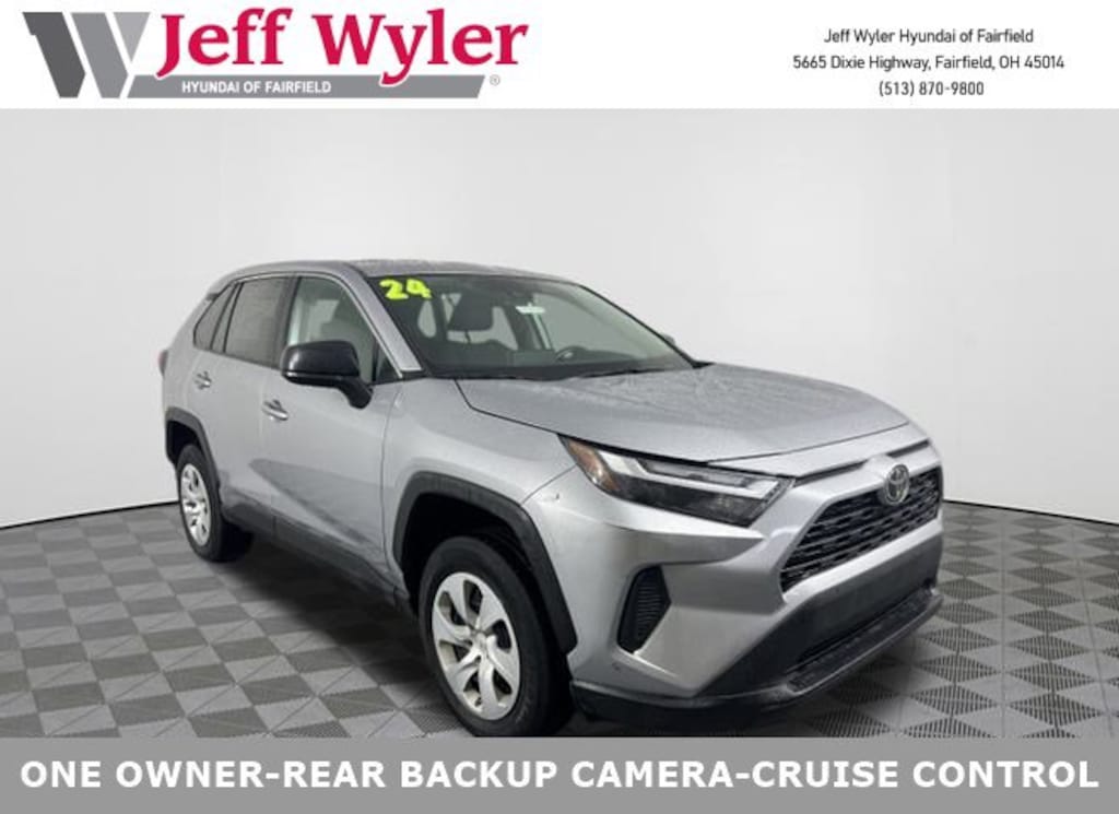 CARFAX One-Owner. Clean CARFAX. Jeff Wyler Hyundai of Fairfield is pleased to offer this gorgeous 2024 Toyota RAV4 Hybrid XLE in Silver. Well equipped with: 2.5L 4-Cylinder, Android Auto, Apple CarPlay, CALL NOW FOR YOUR VIP APPOINTMENT 513-870-9800, FULLY SERVICED w/RECORDS, GUARANTEED FINANCING!! NO MATTER YOUR SITUATION WE CAN GET AN APPROVAL!!, THE #1 Volume dealer in the region! Come see why for yourself Today!!, WE PAY MORE FOR YOUR TRADE!!, 4-Wheel Disc Brakes, 6 Speakers, ABS brakes, Air Conditioning, Alloy wheels, AM/FM radio: SiriusXM, Auto High-beam Headlights, Automatic temperature control, Axle Ratio: TBD, Brake assist, Bumpers: body-color, Delay-off headlights, Driver door bin, Driver vanity mirror, Dual front impact airbags, Dual front side impact airbags, Electronic Stability Control, Emergency communication system: Safety Connect (1-year trial), Exterior Parking Camera Rear, Fabric Seat Trim, Four wheel independent suspension, Front anti-roll bar, Front Bucket Seats, Front Center Armrest, Front dual zone A/C, Front reading lights, Fully automatic headlights, Heated door mirrors, Illuminated entry, Knee airbag, Low tire pressure warning, Occupant sensing airbag, Outside temperature display, Overhead airbag, Overhead console, Panic alarm, Passenger door bin, Passenger vanity mirror, Power door mirrors, Power driver seat, Power steering, Power windows, Radio data system, Radio: AM/FM/XM Audio System, Rear anti-roll bar, Rear seat center armrest, Rear window defroster, Rear window wiper, Remote keyless entry, Speed control, Speed-sensing steering, Split folding rear seat, Spoiler, Steering wheel mounted audio controls, Telescoping steering wheel, Tilt steering wheel, Traction control, Trip computer, Turn signal indicator mirrors, Variably intermittent wipers, and Wheels: 17" x 7.0J Silver Aluminum Alloy. TO CHECK ON THE AVAILABILITY OF THIS VEHICLE REACH OUT TO ONE OF OUR TEAM MEMBERS!! ALSO SHOP ONLINE AT https://www.jeffwylerhyundaioffairfield.com/ Proudly Serving: Cincinnati, Dayton, Columbus, Louisville, Lexington, Indianapolis, Hamilton, Florence, Alexandria, Beavercreek, Springdale, West Chester, Monroe, Fairfield, Kenwood, Newport and all of greater Cincinnati Ohio, Indiana, and Northern Kentucky. New Price!